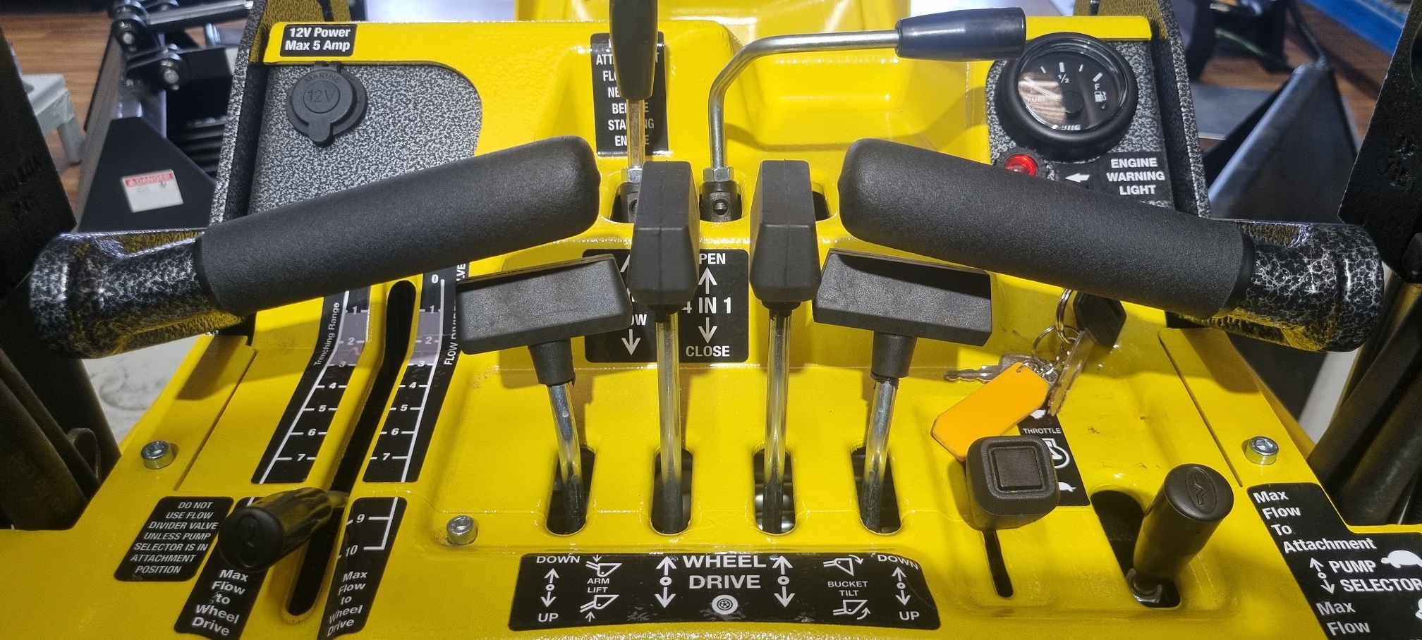 Overall width 1,030 mm Overall length 1,600 mm Overall height 1,200 mm Max operating height 4 in 1 2,080 mm Turning radius with 4 in 1 bucket 1,300 mm Angle of departure 25° Wheel base 800 mm Ground clearance 135 mm Dump height standard bucket 1,450 mm Dump height 4 in 1 bucket 1,835 mm Reach fully raised 4 in 1 bucket 800 mm Height to hinge pin 1,940 mm Machine width 4 in 1 bucket 1,050 Hydraulic reservoir capacity 76 L Machine mass 1,093 kg